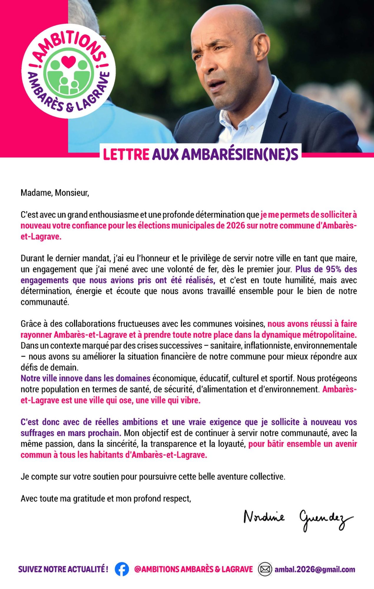 En 2020, les Ambarésiens ont élu une équipe rajeunie et renouvelée qui portait l’ambition de relever les défis d’une ville dynamique, innovante et solidaire, à l’écoute des besoins de chacun. Je me suis investi à 100% pour faire progresser notre ville et améliorer la vie quotidienne des ambarésiens à tous les âges de la vie.